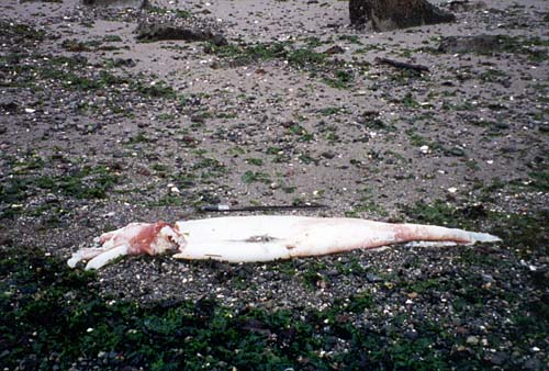 ![]() Photo 1. The author with a Moroteuthis robusta that washed ashore in Puget Sound 20 miles south of Seattle, Washington State, USA. Photo by Vivian Gross. ![]() Photo 2. This clubhook squid was found on a beach 10 miles north of Seattle, Washington State, USA. The knife above the squid is 27 inches long. Photo by Robert Zweibel.