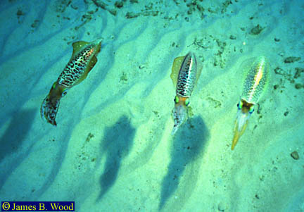 Sepioteuthis sepioidea, Caribbean Reef squid<< Cephalopod SpeciesSepioteuthis sepioidea, the Caribbean Reef squid, is commonly observed in shallow near shore water of the Caribbean by divers and snorkelers. These squid are often confused with cuttlefish because they have large fins that wrap around their mantles. They are also broader than many squid and these traits make them look like cuttlefish (Sepia). Actually, if you look at their scientific name you will see that scientists also noticed that these guys look like cuttlefish—the "Sepio" which is in the genus and specific name refers to the fact that they look like cuttlefish while the "teuthis" tells one that they really are a squid. For the record, there are no true cuttlefish (Order Sepiida) off of North America although there are some Sepiolids. I've had the pleasure of working on the inaugural 1998 squid communication study in Bonaire with Dr. Jennifer Mather, Roland Anderson, Alison King and others. This study was such a success that it has been ongoing ever since and in 2001 I was once again in Bonaire observing reef squid behavior. Believe me, these squid are very interesting to watch, especially at dawn and dusk when the mating displays are most common. The rapid color, shape and texture changes of these squid are amazing and it takes both still images, to capture the detail, and video, to capture the rate of change, to truly show what these animals are capable of. In 2001 we were filmed for 10 days for a Discovery Channel special. I can tell you that some really amazing underwater footage was captured and on the new HD format. I'm looking forward to returning to Bonaire again! School of Caribbean Reef Squid in their typical daytime basic brown coloration. The images shown here were taken by James Wood with a Nikonos V during the 2001 study of communication in reef squid in Bonaire. This project is led by Dr. Jennifer Mather and has been ongoing since 1998. A lighter shade of pale. When a predator swims by the squid quickly change color, often to pale and jet away. Another trick they do when predators are around is a dynamic pattern. The squid orients itself perpendicular to the predator and stretches out its mantle and fins making it look larger. It also flashes 2 or 4 eye spots. In this case, the signal was directed at me as I was getting to close with my camera. Ruth Byrne an graduate student of the Konrad Lorenz Institute in Austria were able to accurately identify over 100 squid based on the patter of dots on their fins. This enabled the team to follow the same squid every day. Same squid, different color. Not only is the range of colors is amazing in these animals but the speed of the changes is incredible! This is a courting pair of squid. The male (top and underneath) is doing a really nice stripe display while the female is doing a partial saddle. Sometimes things heat up. These two males are displaying zebra displays to each other. This can escalate to both squid rising in the water column and challenging each other. The winner gets the female—well if she hasn't left both of them for a third squid that is. During these contests the males are very visible and oblivious to predators. Can animals send two completely different messages at once? Squid can! The male in the middle of this image is giving the male on the left the zebra with half of his body and signaling an entirely different thing to the available female on the right. If all goes well, the couple will be swimming parallel to each other, occasionally changing directions, and signaling saddle (interest?) and stripe (intention to mate?). This can lead to a very fast mating—if you blink you missed it. We were extremely lucky to observe, film and photograph egg laying in Caribbean Reef squid. The female, escorted by her partner, finds a rock and attaches her eggs to the underside of it. In a few months both squid will be dead and the next generation will continue the cycle.