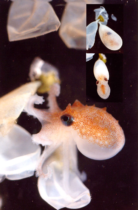 Bathypolypus arcticus<< Cephalopod SpeciesBathypolypus arcticus is a deep sea octopus that is typically found at depths from 200-600 m in the Atlantic Ocean (Boyle 1987). This species of octopus is small; an average adult from the lower Bay of Fundy weighs around 45 grams, smaller than your hand. My Ph.D. thesis was studying these remarkable animals. ![]() Deep sea octopuses generally do not have ink sacks, have low fecundity (which means they don't lay very many eggs), lay large eggs from which benthic young hatch, and often have large reproductive organs. Female B. arcticus brood their eggs for over 400 days in the wild! During this time they stop eating and slowly waste away as they metabolize their own bodies to provide energy to care for their young. Deep sea octopuses have longer life spans than their shallow water relatives. For example, the deep sea octopus Bathypolypus arcticus was previously thought to live for 3 years (O'Dor and Macalaster, 1983) which is a long time for a small octopus. My recent work shows that they can live for six years or more! In comparison, many shallow water octopuses only live for a year. There is a special feeling when observing something for the first time; especially something that no one else in the world has ever seen before. This is one of the rewards of working with a species like B. arcticus that most scientists, even those who study cephalopods, have never seen, much less worked with. Although others have tried, I was the first to witness them mating. Even more exciting was observing the little hatchlings emerge from their eggs. I will share some of the images with you - a hatchling B.arcticus (jpg). The hatchlings octopuses were involved in experiments testing the effect of temperature on growth rate, the effect of different foods on growth rate and survival, as well as some behavioral experiments. A B. arcticus is born (Photo's taken from high-8 video by James. Thanks to Dave Gaudet, for shooting the video.) Jonathan Bird has kindly donated two of his images of B. arcticus to The Cephalopod Page: ![]() ![]() References and CreditsCreditsThe photograph is of one of James's octopuses. The octopus was collected in the Bay of Fundy.The color photos of a baby Bathy hatching are by myself. The black and white photo's of B. arcticus hatching were made by myself from high-8 video filmed by Dave Gaudet. Jonathan Bird donated two of his images of B. arcticus. ReferencesO'Dor, R. K. and E. G. Macalaster. 1983. Bathypolypus arcticus Ed Boyle, P.R. Cephalopod Life Cycles. Vol 1. Academic Press, London. 401-410pp.Wood, J. B., Kenchington, E. and O'Dor R. K. In press Reproduction and embryonic development time of Bathypolypus arcticus, a deep-sea octopod (Cephalopoda: Octopoda). Malacologia